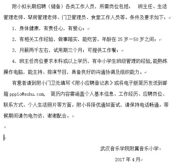 武汉音乐学院附属小学拟招聘各类工作人员